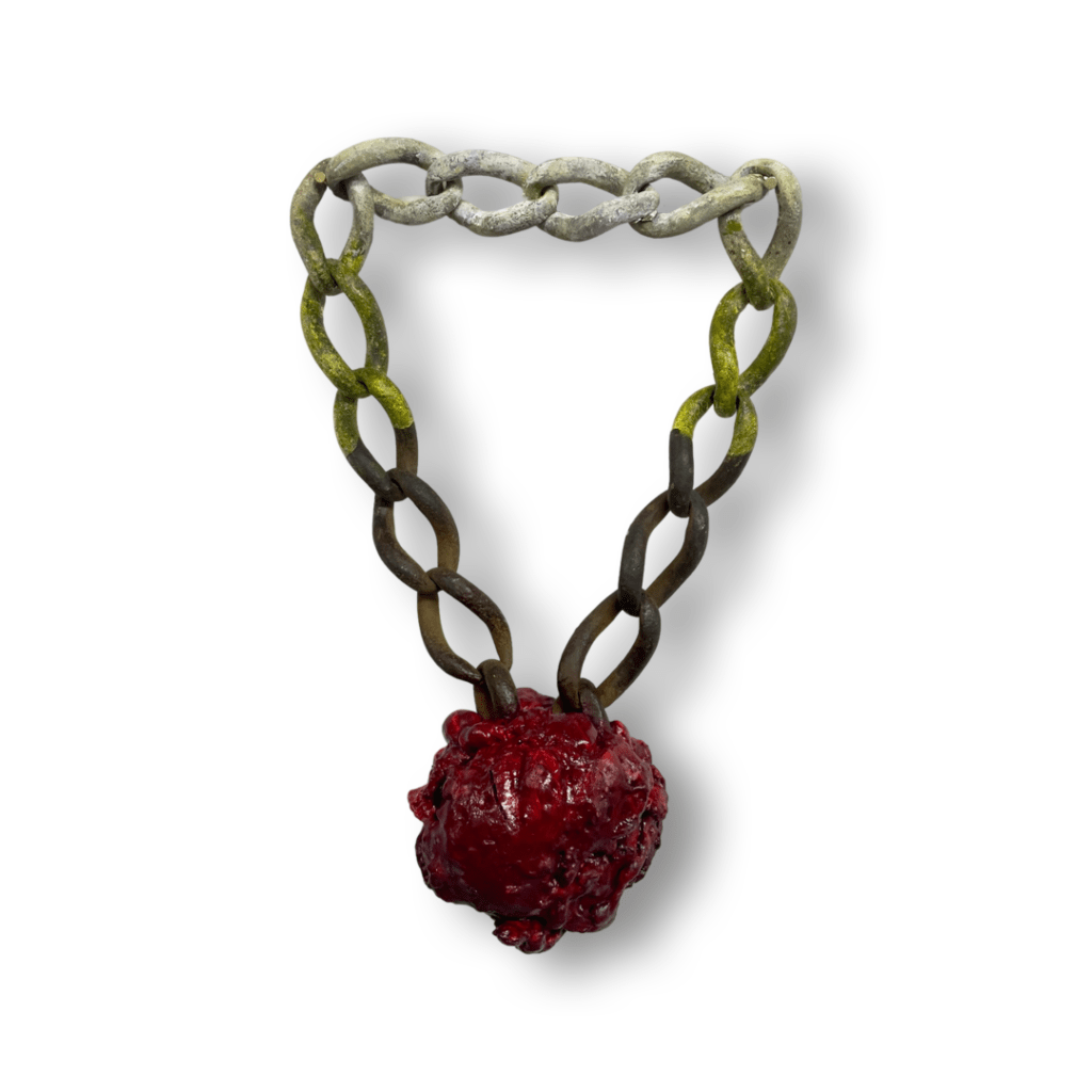 Accessibility ID: The object is surrounded by a white background. Both ends of the chain are brought together with viscera. The chain hangs by two nails and makes the chain form an inverted triangle. The chain is rusty. At the top half of the chain, it turns from distressed white, to green gold, the rest of the way down is unpainted. The viscera bringing the chain together is blood red.